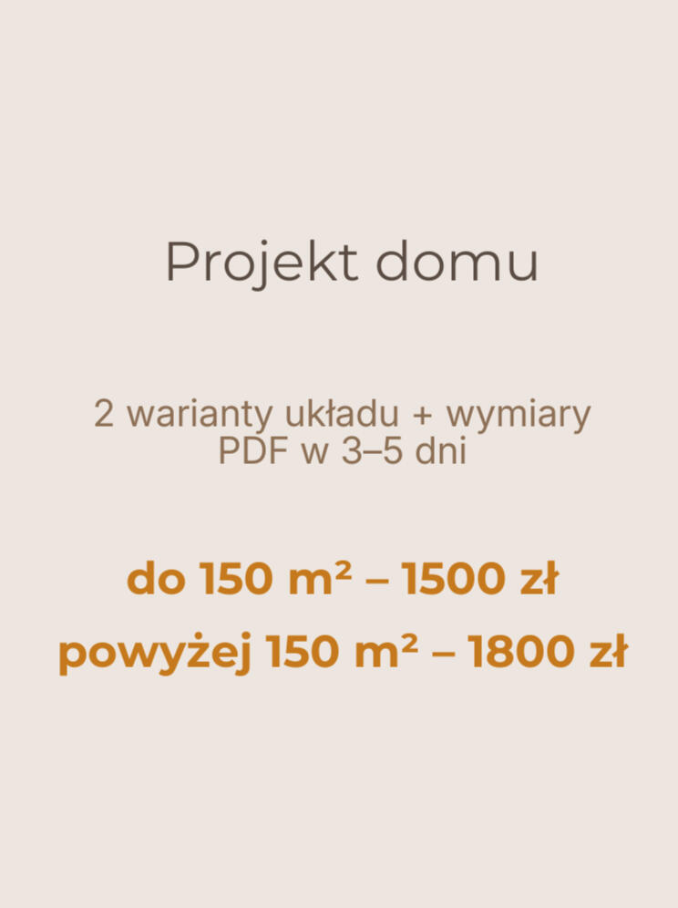 2–3 warianty funkcjonalne mieszkania lub domu. Gotowy PDF w 3–5 dni.