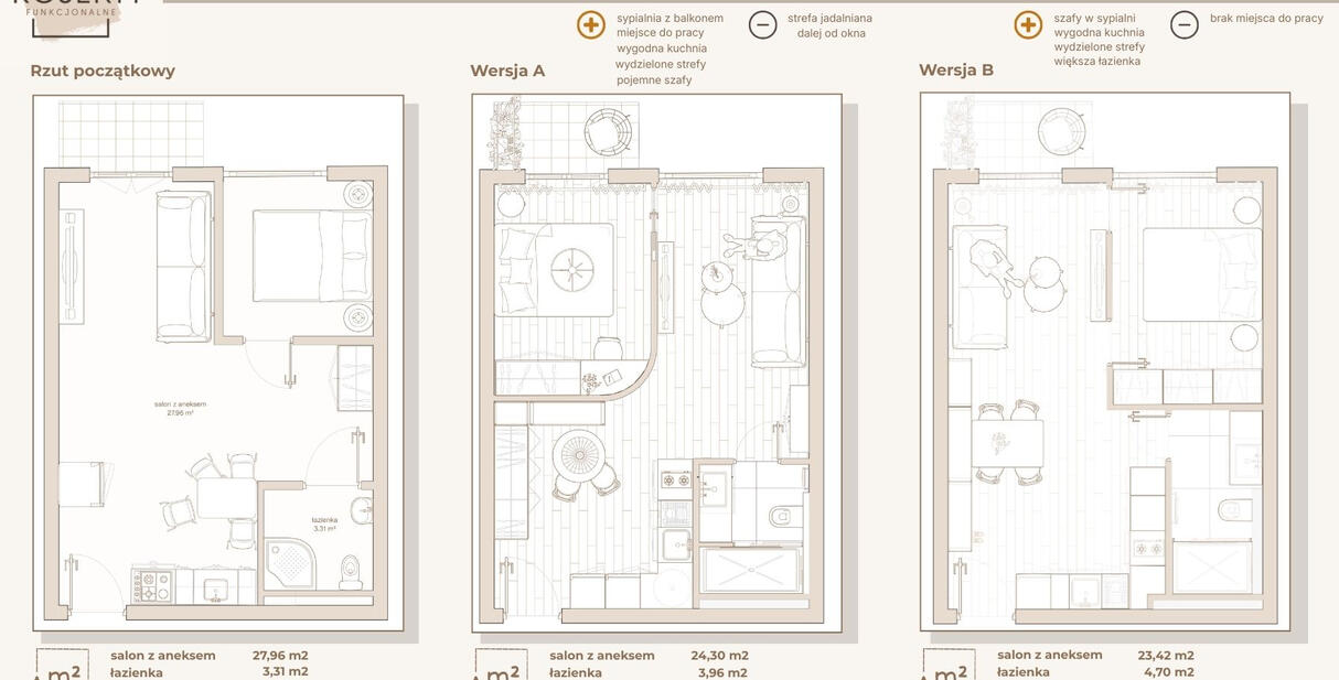 Na podstawie przekazanych informacji opracowujemy 2 funkcjonalne warianty układu z czytelnymi wymiarami i logicznym rozmieszczeniem stref.